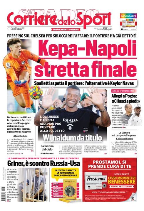 Il Corriere dello Sport, nella sua edizione Campania di oggi, apre in prima pagina con le mosse del Napoli sul mercato in tema portieri: ”Kepa-Napoli: stretta finale. Pressing sul Chelsea per sbloccare l'affare: il portiere ha già detto sì. Spalletti aspetta il portiere: l'alternativa è Keylor Navas. Da limare con i Blues la copertura dei costi relativi all'ingaggio dello spagnolo. Altro nodo: i termini del diritto di riscatto". Al centro spazio alla Roma: "Wijnaldum da titulo".