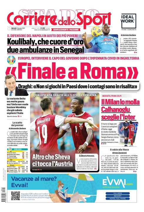 “Koulibaly, che cuore d’oro: due ambulanze in Senegal". Titola così in prima pagina Il Corriere dello Sport, nella sua edizione Campania di oggi, per parlare del bel gesto di Kalidou Koulibaly. Al centro si parla dell'ipotesi Roma come luogo della finale di Euro2020. Ipotesi lanciata dal premier Mario Draghi, ma poi respinta dalla Uefa. Sulla destra il mercato: "Il Milan lo molla. Calhanoglu sceglie l'Inter". In taglio basso l'Austria che passa il turno e sfiderà l'Italia agli ottavi di finale.
