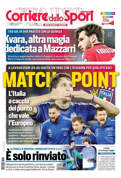 “Kvara, altra magia dedicata a Mazzarri”. Titola così in taglio alto il Corriere dello Sport nella sua edizione Campania di oggi: "Tre gol in due partite con la Georgia. Khvicha a segno anche contro la Spagna: è pronto per il Napoli. Ma il ct Sagnol: 'Lo cercano Real, Barcellona e Bayern'".