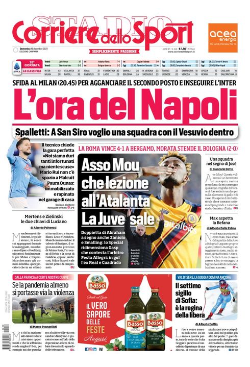 Il Corriere dello Sport, nella sua edizione Campania di oggi, apre in prima pagina con la sfida di questa sera tra Milan e Napoli: “L’ora del Napoli. Sfida al Milan per agganciare il secondo posto e inseguire l'Inter. Spalletti: a San Siro voglio una squadra con il vesuvio dentro. Il tecnico chiede la gara perfetta. Mario Rui non c'è, spazio a Malcuit. Paura Ounas: immobilizzato e rapinato nel garage di casa". Al centro la Roma e il successo a Bergamo: "Asso Mou, lezione all'Atalanta". Si parla anche della Juve e della vittoria a Bologna.