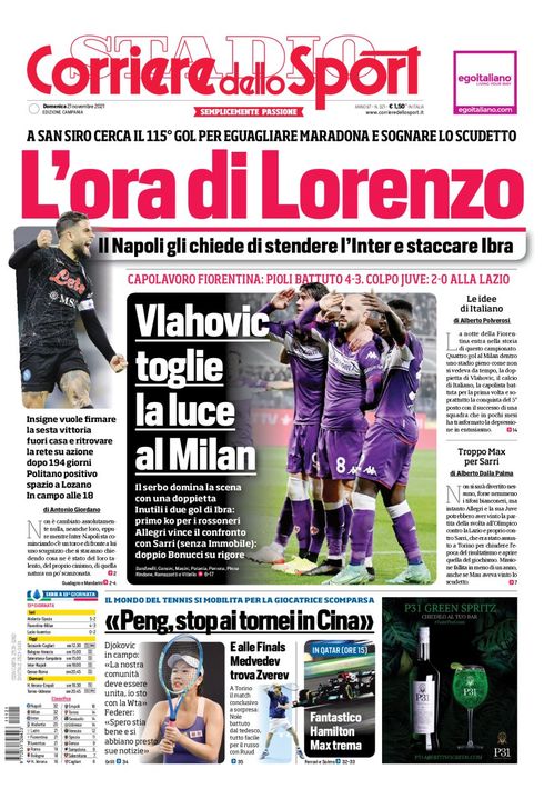 Il Corriere dello Sport, nella sua edizione Campania di oggi, apre in prima pagina con la sfida di San Siro tra Inter e Napoli: "L'ora di Lorenzo. A San Siro cerca il 115º gol per eguagliare Maradona e sognare lo Scudetto. Il Napoli gli chiede di stendere l'Inter e staccare Ibra. Insigne vuole firmare la sesta vittoria fuoricasa e ritrovare la rete su azione dopo 194 giorni. Politano positivo, spazio a Lozano. In campo alle 18". Si parla anche della prima sconfitta in campionato del Milan e della vittoria della Juve a Roma: "Vlahovic toglie la luce al Milan", "Colpo Juve: 2-0 alla Lazio".