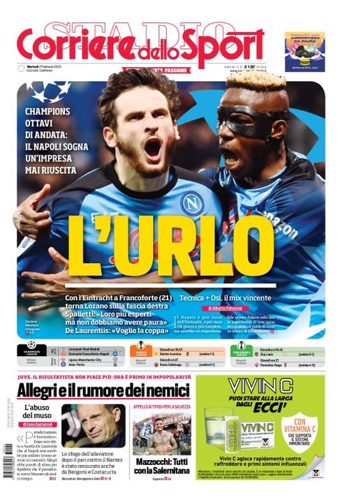 Il Corriere dello Sport, nella sua edizione Campania di oggi, dedica la prima pagina al Napoli, impegnato stasera contro l'Eintracht Francoforte per l'andata degli ottavi di finale di Champions League: "L'urlo. Il Napoli sogna un'impresa mai riuscita. Con l'Eintracht Francoforte (21) torna Lozano sulla fascia destra. Spalletti: 'Loro più esperti, ma non dobbiamo avere paura'. De Laurentiis: 'Voglio la coppa'".