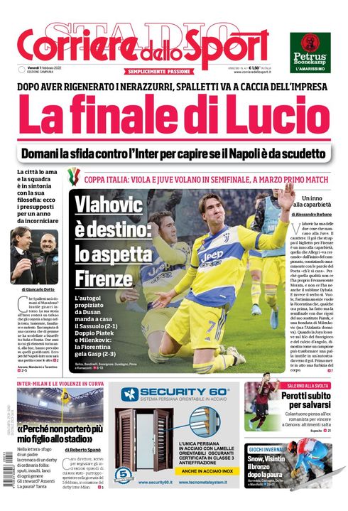 Il Corriere dello Sport, nella sua edizione Campania di oggi, apre in prima pagina con il big match di domani tra Napoli e Inter: "La finale di Lucio. Dopo aver rigenerato i nerazzurri, Spalletti va a caccia dell'impresa. Domani la sfida contro l'Inter per capire se il Napoli è da Scudetto. La città lo ama e la squadra è in sintonia con la sua filosofia: ecco i presupposti per un anno da incorniciare". Al centro si parla della vittoria della Juventus in Coppa Italia: "Vlahovic è destino: lo aspetta Firenze".