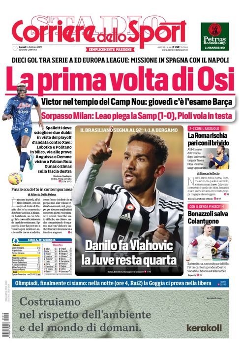 “La prima volta di Osi", apre così in prima pagina il Corriere dello Sport, nella sua edizione Campania di oggi. "Victor nel tempio del Camp Nou: giovedì c'é l'esame Barça. Spalletti deve sciogliere due dubbi in vista dei playoff d'andata contro Xavi: Lobotka e Politano in bilico. Via alle prove Anguissa o Demme vicino a Fabian Ruiz. Ounas o Elmas sulla fascia destra". Di spalla spazio al pari in rimonta della Salernitana a Marassi con Genoa: "Bonazzoli salva Colantuono".