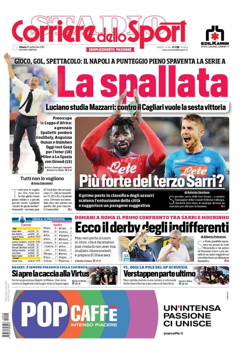 Il Corriere dello Sport, nella sua edizione Campania di oggi, apre in prima pagina con il Napoli di Spalletti, capolista in campionato: "La spallata. Gioco, gol, spettacolo: il Napoli a punteggio pieno spaventa la Serie A. Luciano studia Mazzarri: contro il Cagliari vuole la sesta vittoria". A centro pagina: "Più forte del terzo Sarri? Il primo posto degli azzurri scatena l'entusiasmo della città e suggerisce un paragone suggestivo". In taglio basso spazio al derby capitolino di domani: "Ecco il derby degli indifferenti".