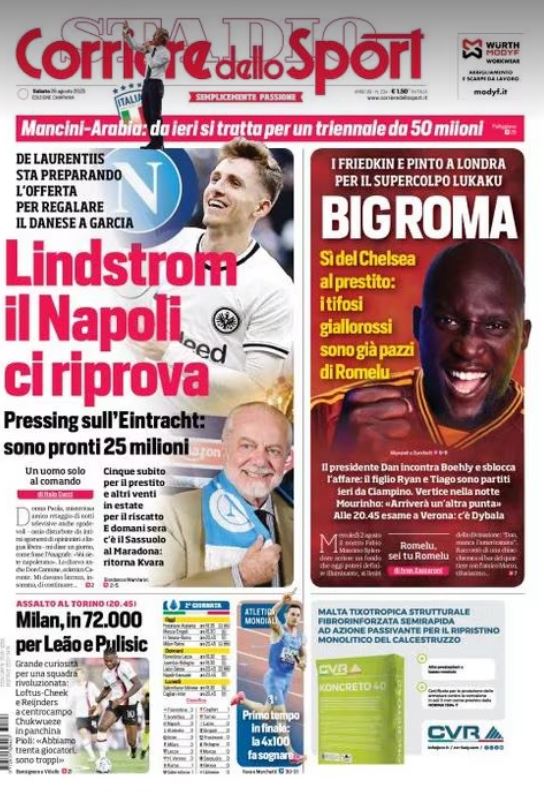 Sarà Lindstrom l'ultimo colpo di mercato del Napoli? Per il Corriere dello Sport c'è un tentativo in corso da parte del club azzurro. "Lindstrom, il Napoli ci riprova", titola in prima pagina l'edizione campana del quotidiano: "Pressing sull'Eintracht: sono pronti 25 milioni".