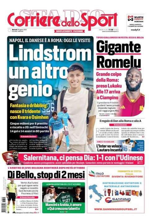 “Lindstrom, un altro genio”. Titola così il Corriere dello Sport nella sua edizione Campania di oggi: “Il danese è a Roma: oggi le visite. Fantasia e dribbling: nasce il tridente con Kvara e Osimhen. Cinque milioni per il prestito e riscatto a 20: nell’Eintracht 14 gol e 14 assist in 80 partite”.