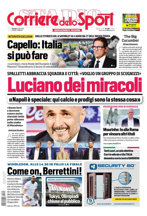 “Luciano dei miracoli. Spalletti abbraccia squadra e città: "Voglio un gruppo di scugnizzi". "Napoli è speciale: qui calcio e prodigi sono la stessa cosa"". Il Corriere dello Sport, nella sua edizione Campania di oggi, apre in prima pagina confla conferenza stampa di Luciano Spalletti da nuovo allenatore del Napoli. In alto l'intervista a Fabio Capello che si dice fiducioso in vista della finale di Euro 2020: "Italia, si può fare". Di spalla, le prime parole di Josè Mourinho: "Io alla Roma per vincere titoli".