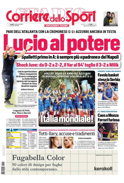 Il Corriere dello Sport, nella sua edizione Campania di oggi, titola in prima pagina: "Lucio al potere. Spalletti primo in A: è sempre più 'padrone' del Napoli. Calcio spettacolare. Tifosi conquistati da Kvara e compagni". In taglio basso il botta e risposta tra Francesco Totti e Ilary Blasi: "Totti-Ilary, accuse e tradimenti".
