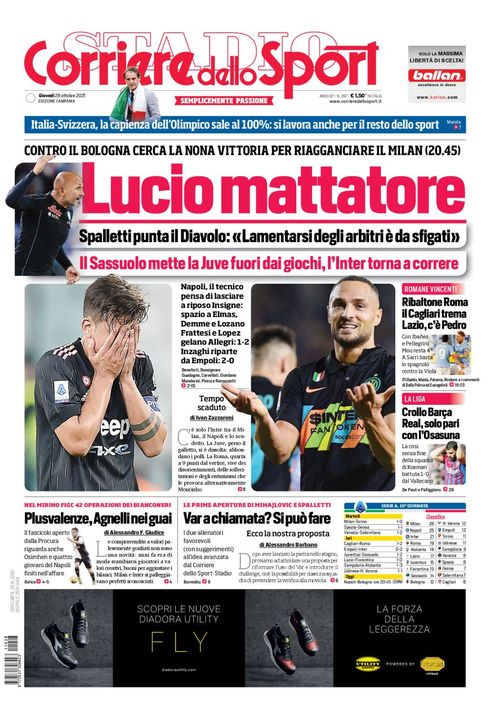 "Lucio mattatore", apre così in prima pagina il Corriere dello Sport, nella sua edizione Campania di oggi. "Spalletti punta il Diavolo: 'Lamentarsi degli arbitri è da sfigati'. Contro il Bologna cerca la nona vittoria per raggiungere il Milan (20.45)". In taglio basso spazio all'indagine della Procura Federale sulle plusvalenze: "Agnelli nei guai. Il fascicolo aperto dalla Procura riguarda anche Osimhen e quattro giovani del Napoli finiti nell'affare".