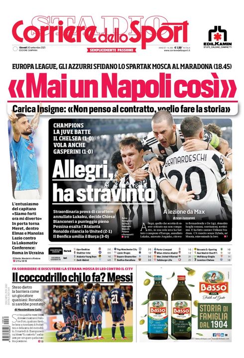 Il Corriere dello Sport, nella sua edizione Campania di oggi, apre in prima pagina con le dichiarazioni di Lorenzo Insigne alla vigilia di Napoli-Spartak Mosca: "Mai un Napoli così. Non penso al contratto, voglio fare la storia. Siamo forti ora mi diverto". le scelte di Spalletti per la sfida di Europa League: "In porta torna Meret, dentro Elmas e Manolas". A centro pagina la strana mossa di Messi contro il City che fa sorridere e discutere: "Il coccodrillo chi lo fa? Messi".