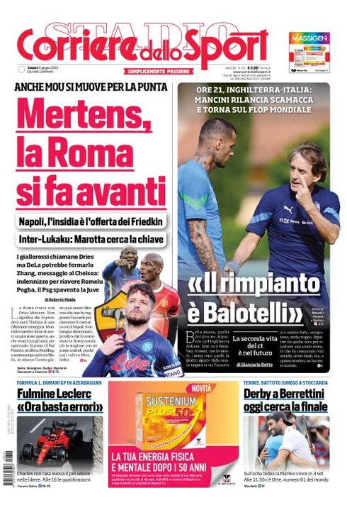 Il Corriere dello Sport, nella sua edizione Campania di oggi, apre in prima pagina con il futuro di Dries Mertens: “Mertens, la Roma si fa avanti. Anche Mou si muove per la punta. Napoli, l'insidia è l'offerta dei Friedkin. I giallorossi chiamano Dries ma DeLa potrebbe fermarlo". Spazio anche al calciomercato di Inter e Juve: "Inter-Lukaku, Marotta cerca la chiave. Pogba, il Psg spaventa la Juve". In taglio centrale la Nazionale di scena quest'oggi contro l'Inghilterra: "Il rimpianto è Balotelli".