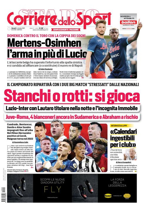 "Mertens-Osimhen, l'arma in più di Lucio", apre così in prima pagina il Corriere dello Sport, nella sua edizione Campania di oggi. "Domenica contro il Toro con la coppia dei sogni. L'attaccante belga ha superato l'infortunio alla spalla sinistra e si candida ad affiancare (o a sostituire) il nuovo re di Napoli". Di spalla spazio all'intervista a Marcello Lippi: "Calendari ingestibili per i club".