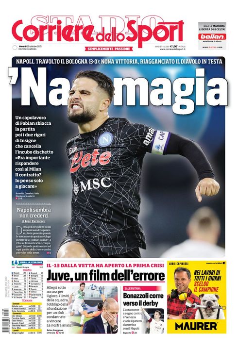 Il Corriere dello Sport, nella sua edizione Campania di oggi, apre in prima pagina con la travolgente vittoria del Napoli che contro il Bologna ha messo a segno la sua nona vittoria in Serie A in 10 partite: “’Na magia. Napoli, travolto il Bologna (3-0): nona vittoria, riagganciato il diavolo in testa. Un capolavoro di Fabian sblocca la partita poi i due rigori di Insigne che cancella l'incubo dischetto". In basso la crisi della Juventus distante 13 punti dal primo posto.