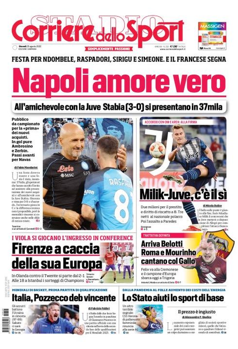 ”Napoli amore vero”, titola così il Corriere dello Sport nella sua edizione Campania di oggi. "Festa per Ndombele, Raspadori, Sirigu e Simeone. E il francese segna. All'amichevole con la Juve Stabia (3-0) si presentano in 37mila. Pubblico del campionato per la prima dei nuovi acquisti. In gol pure Ambrosino e Zerbin. Passi avanti per Navas".