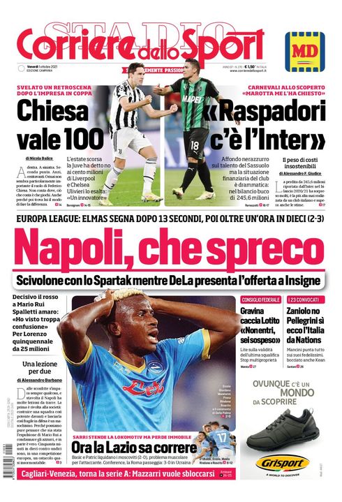Il Corriere dello Sport, nella sua edizione Campania di oggi, apre in prima pagina con l'amara sconfitta casalinga del Napoli: “Napoli, che spreco. Europa League: Elmas segna dopo 13 secondi, poi oltre un'ora in 10 (2-3). Scivolone con lo Spartak mentre DeLa prepara l'offerta a Insigne". In taglio alto Juve e Inter: "Chiesa vale 100. Raspadori, c'è l'Inter". In basso la vittoria in Europa League della Lazio: "Ora la Lazio sa correre" e sulla destra i convocati di Mancini per la Nations League.