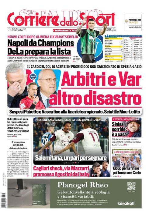 Il Corriere dello Sport, nella sua edizione Campania di oggi, apre in prima pagina con le mosse del Napoli per il prossimo calciomercato: “Napoli da Champions, DeLa prepara la lista. Nuovi colpi dopo Olivera e Kvaratskhelia. Fabian in bilico, Mertens verso il rinnovo. Anguissa sarà riscattato. Nodo Osimhen: idea Scamacca. Seguiti Simeone, Barak e Hickey". Al centro spazio al gol in fuorigioco convalidato in Spezia-Lazio: "Arbitri e Var, altro disastro. Sospesi Pairetto e Nasca fino alla fine del campionato. Scintille Mou-Lotito". In taglio alto spazio al confronto tra Perisic e Leao per la corsa scudetto di Milan e Inter. Al centro si parla del pareggio tra Atalanta e Salernitana. Di spalla la buona notizia delle dimissioni dall'ospedale di Mihajlovic, in taglio basso l'esonero di Mazzarri.