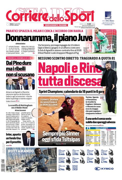 Il Corriere dello Sport, nella sua edizione Campania di oggi, apre in prima pagina con la corsa Champions del Napoli: “Napoli e Rino tutta discesa. Nessuno scontro diretto: traguardo a quota 81. Sprint Champion: calendario da 18 punti in 6 gare”. In taglio alto spazio al calciomercato e al piano della Juventus per portare Donnarumma in bianconero. Sulla sinistra le tensioni dopo l'Assemblea di Lega e al centro si parla di tennis e dell'impegno di Sinner.