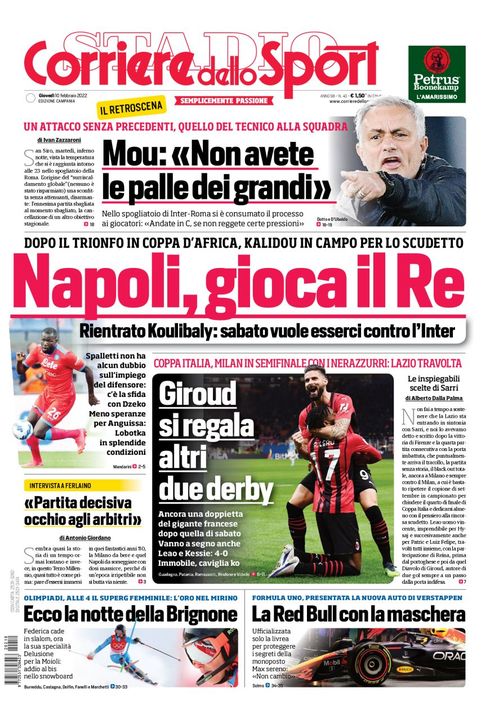"Napoli, gioca il Re", apre così in prima pagina il Corriere dello Sport, nella sua edizione Campania di oggi: "Napoli, gioca il Re. Rientrato oggi Koulibaly, vuole esserci contro l'Inter. Dopo il trionfo in Coppa d'Africa, Kalidou in campo per lo scudetto. Spalletti non alcun dubbio sull'impiego del difensore: c'è la sfida con Dzeko. Meno speranze per Anguissa: Lobotka in splendide condizioni".