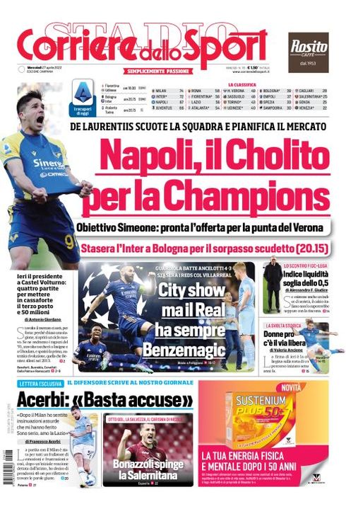 Il Corriere dello Sport, nella sua edizione Campania di oggi, apre con un'indiscrezione di mercato: "Napoli, il Cholito per la Champions. De Laurentiis scuote la squadra e pianifica il futuro. Obiettivo Simeone: pronta l'offerta per la punta del Verona. Ieri il presidente a Castel Volturno: quattro partite per mettere in cassaforte il terzo posto e 50 milioni".