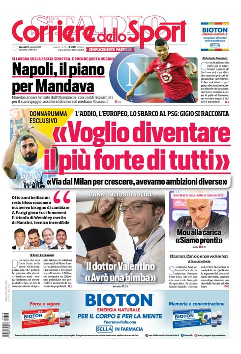 Il Corriere dello Sport, nella sua edizione Campania di oggi, apre in prima pagina con il mercato azzurro: "Napoli, il piano per Mandava. Si lavora per la fascia sinistra. E prende quota Rugani. Manolas ancora tentato dall'Olympiacos: con i soldi risparmiati per il suo ingaggio, assalto al terzino e al mediano Youssouf". A centro pagina l'intervista esclusiva a Gigio Donnarumma: "Voglio diventare il più forte di tutti. Via dal Milan per crescere, avevamo ambizioni diverse".