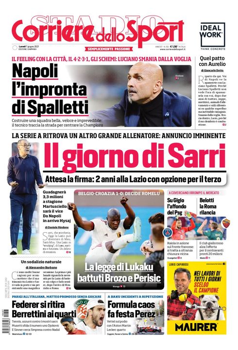 Il Corriere dello Sport, nella sua edizione Campania di oggi, apre in prima pagina con la costruzione del nuovo Napoli di Spalletti: "Napoli, l'impronta di Spalletti. Il tecnico traccia la strada per centrare la Champions". Di spalla spazio al calciomercato: "Su Gigio l'affondo del Psg. Si tratta a oltranza, chiusura vicina". "Belotti, la Roma rilancia. Il club giallorosso alza l'offerta per il centravanti: pronti 20 milioni".