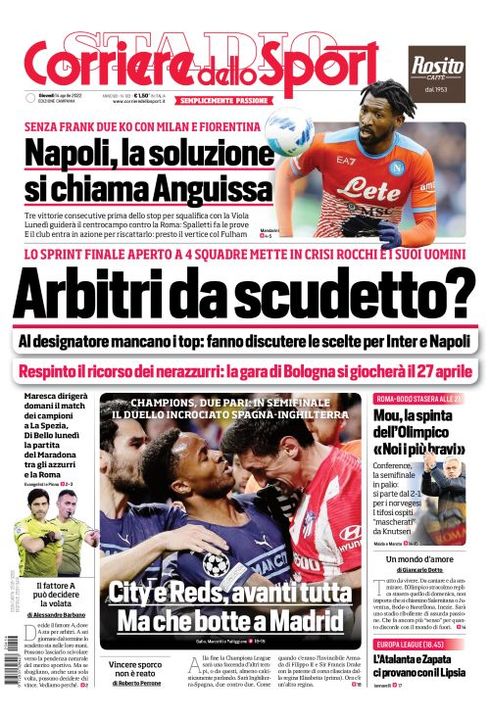 "Napoli, la soluzione è Anguissa", questa l'apertura in prima pagina del Corriere dello Sport di quest'oggi nella sua edizione Campania. "Tre vittorie consecutive prima dello stop per squalifica con la Viola. Lunedì guiderà il centrocampo contro la Roma. Spalletti fa le prove e il club entra in azione per riscattarlo: presto il vertice col Fulham". Di spalla spazio alla Roma in campo oggi contro il Bodo/Glimt: "Mou, la spinta dell'Olimpico: 'Noi i più bravi'".