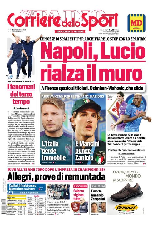 Il Corriere dello Sport, nella sua edizione Campania di oggi, apre in prima pagina con le mosse di Spalletti per mettere alle spalle la sconfitta con lo Spartak Mosca: “Napoli, Lucio rialza il muro. A Firenze spazio ai titolari. Osimhen-Vlahovic, che sfida. La difesa migliore della Serie A domani ritrova Ospina e si rimette alla prova contro l'attacco viola. Tra i bomber è partita doppia". In basso spazio al derby di Torino: "Allegri, prove di remuntada". Al centro la Nazionale: "L'Italia perde Immobile, e Mancini punge Zaniolo".