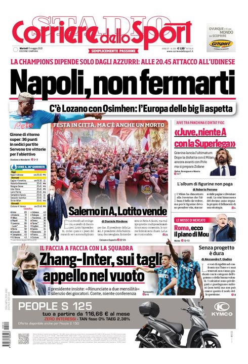 Il Corriere dello Sport, nella sua edizione Campania di oggi, apre in prima pagina con la corsa alla Champions del Napoli, chiamato a giocare questa sera contro l’Udinese: “Napoli, non fermarti, C'è Lozano con Osimhen: l'Europa delle big li aspetta”. Al centro la promozione in Serie A della Salernitana "Salerno in A, Lotito vende". In taglio basso la situazione finanziaria dell'Inter: "Zhang-Inter, sui tagli appelli nel vuoto". Sulla destra le parole di Gravina: "Juve, niente A con la Superlega".