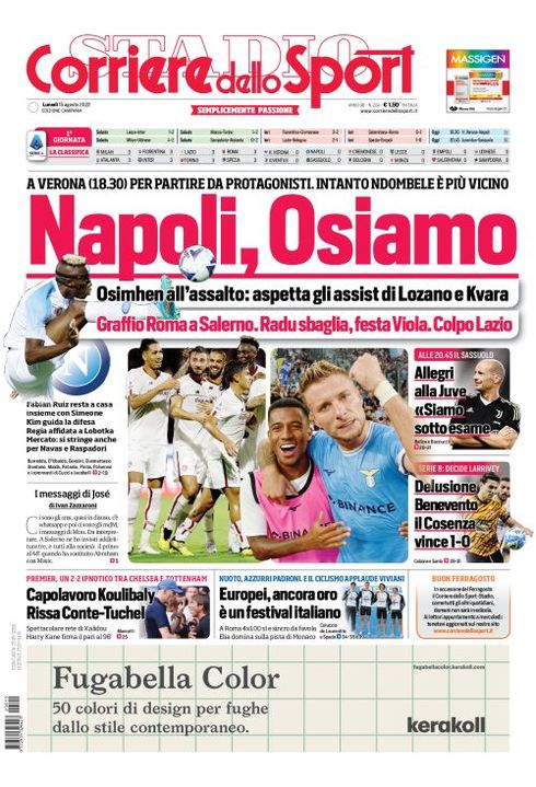 Il Corriere dello Sport, nella sua edizione Campania di oggi, apre in prima pagina con l'esordio del Napoli in campionato nel segno di Osimhen: "Napoli, Osiamo. Osimhen all'assalto: aspetta gli assist di Lozano e Kvara. A Verona (18.30) per partire da protagonisti. Intanto Ndombele più vicino". Ancora Napoli di spalla: "Fabian Ruiz resta a casa insieme con Simeone. Kim guida la difesa. Regia affidata a Lobotka. Mercato: si stringe anche per Navas e Raspadori".