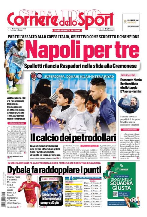 “Napoli per tre”. Titola così in taglio alto il Corriere dello Sport nella sua edizione Campania di oggi. "Parte l'assalto alla Coppa Italia, obiettivo come Scudetto e Champions. Spalletti rilancia Raspadori nella sfida alla Cremonese. Al Maradona (21) c'è l'esordiente Ballardini. I big a riposo: in attacco gioca anche il Cholito. Terna arbitrale tutta femminile".