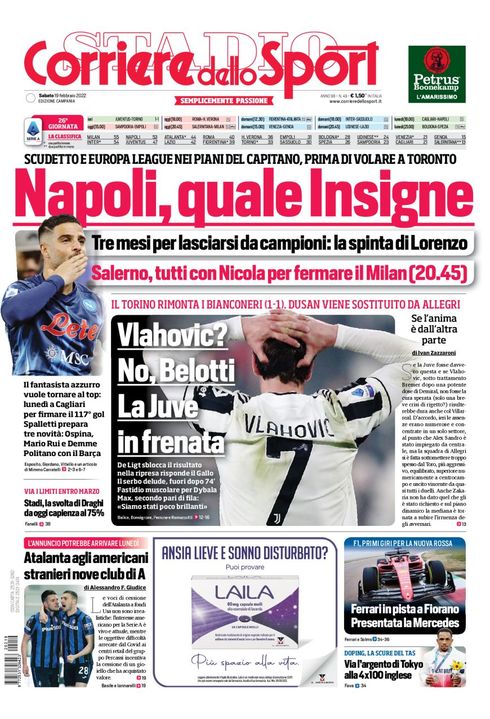 Il Corriere dello Sport, nella sua edizione Campania di oggi, apre in prima pagina con il momento del capitano del Napoli: "Napoli, quale Insigne. Scudetto e Europa League nei piani del capitano, prima di volare a Toronto. Tre mesi per lasciarsi da campioni: la spinta di Lorenzo. Il fantasista azzurro vuole tornare al top lunedì a Cagliari per firmare il 117 gol. Spalletti prepara tre novità: Ospina, Mario Rui e Demme. Politano per il Barcellona". Al centro si parla anche della sfida tra Salernitana e Milan: "Salerno, tutti con Nicola per fermare il Milan" e del pari della Juventus: "Vlahovic? No, Belotti. La Juve in frenata".