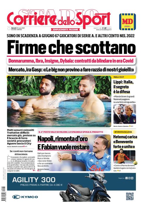 Il Corriere dello Sport, nella sua edizione Campania di oggi, apre in prima pagina con la situazione contrattuale di Lorenzo Insigne: “Firme che scottano”. 67 giocatori di Serie A in scadenza a giugno: "Donnarumma, Ibra, Insigne, Dybala: contratti da blindare in era Covid". In taglio basso la situazione in casa Napoli e il futuro di Fabian Ruiz: “Napoli rimonta d’oro. E Fabian vuole restare”. Di spalla l'intervista all'ex ct Marcello Lippi: "Lippi: Italia, il segreto è la difesa".