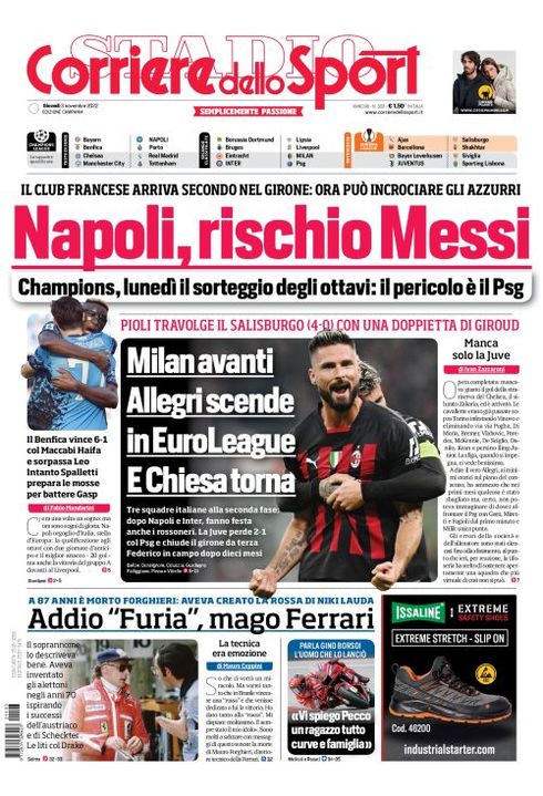 Il Corriere dello Sport, nella sua edizione Campania di oggi, apre in prima pagina con i possibili avversari del Napoli negli ottavi di Champions League: "Napoli, rischio Messi. Champions, lunedì il sorteggio degli ottavi: il pericolo è il Psg. Il club francese arriva secondo nel girone: ora può incrociare gli azzurri". A centro pagina spazio ai risultati delle altre italiane in Champions: "Milan avanti. Allegri scende in Europa League. E Chiesa torna".