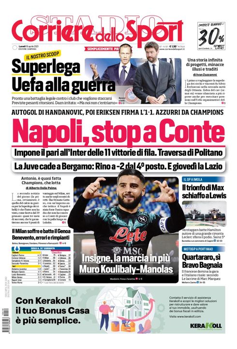 Il Corriere dello Sport, nella sua edizione Campania di oggi, apre in prima pagina con il pareggio tra Napoli e Inter: "Napoli, stop a Conte. Impone il pari all'Inter delle 11 vittorie di fila. Traversa di Politano". A centro pagina i protagonisti del match: "Insigne, la marcia in più. Muro Koulibaly-Manolas".