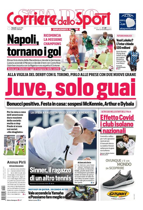 Il Corriere dello Sport, nella sua edizione Campania di oggi, apre in prima pagina con il rientro dei giocatori impegnati con le nazionali: “Napoli, tornano i gol”. Spazio poi ai problemi in casa Juventus in vista del derby contro il Torino: "Juve solo guai. Bonucci positivo. Festa in casa: sospesi Mckennie, Arthur e Dybala". Nel taglio alto l'Inter fissa il prezzo sul gigante belga: "Vuoi Lukaku? 120 milioni!".