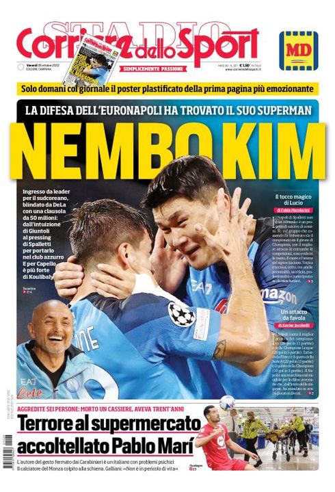 “Nembo Kim”. Titola così il Corriere dello Sport nella sua edizione Campania di oggi. "La difesa dell'EuroNapoli ha trovato il suo Superman. Ingresso da leader per il sudcoreano, blindato da DeLa con una clausola da 50 milioni: dall'intuizione di Giuntoli al pressing di Spalletti per portarlo nel club azzurro. E per Capello è più forte di Koulibaly".