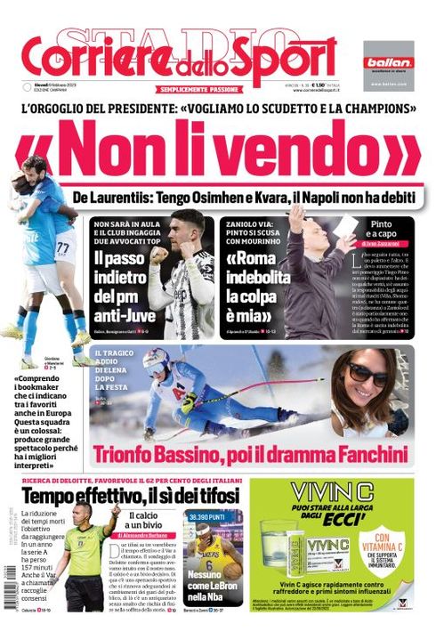 Il Corriere dello Sport, nella sua edizione Campania di oggi, apre in prima pagina con le dichiarazioni di De Laurentiis rilasciate a Bild: "Non li vendo. Tengo Osimhen e Kvara, il Napoli non ha debiti". "L'orgoglio del presidente: 'Vogliamo lo scudetto e la Champions. Comprendo i bookmaker che ci indicano tra i favoriti anche in Europa. Questa squadra è un colossal: produce grande spettacolo perché ha i migliori interpreti'".
