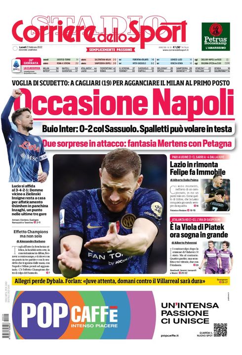 Il Corriere dello Sport, nella sua edizione Campania di oggi, apre in prima pagina con la lotta scudetto: “Occasione Napoli. Voglia di scudetto: a Cagliari per riagganciare il Milan al primo posto. Buio Inter: 0-2 col Sassuolo. Spalletti può volare in testa. Due sorprese in attacco: fantasia Mertens con Petagna. Lucio si affida al 3-4-2-1: Demme vicino a Zielinski. Insigne resta a casa per affaticamento, Osimhen in panchina. Inzaghi, un punto nelle ultime tre gare". Sulla destra il pareggio della Lazio e il successo della Fiorentina sull'Atalanta.