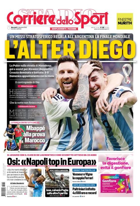 Il Corriere dello Sport, nella sua edizione Campania di oggi, apre in prima pagina con le parole di Victor Osimhen rilasciate in un'intervista sul web: "Napoli top in Europa. Qui ho tanti obiettivi e mi sento al massimo: per arrivare in alto ho sconfitto anche chi non credeva in me". In taglio basso spazio ai guai fisici di Pogba, che salta la sfida con il Napoli: "Juve, calvario Pogba: salta altre 5 partite".