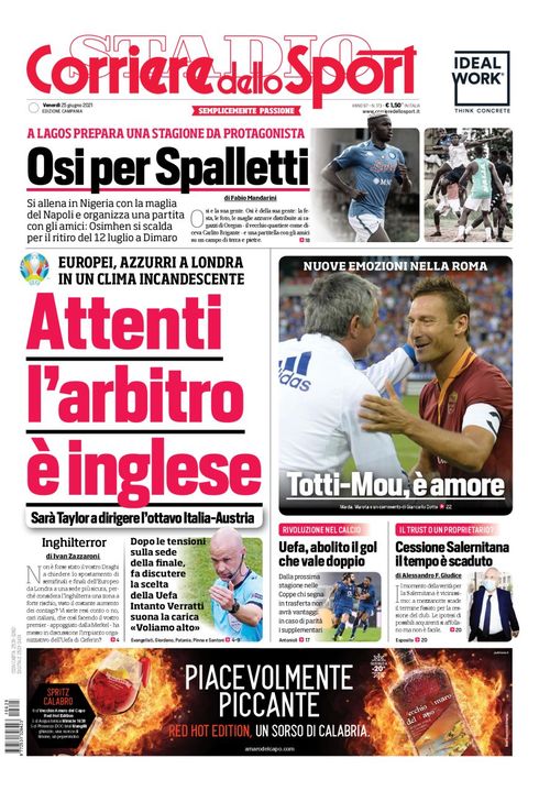 “Osi per Spalletti”. Il Corriere dello Sport, nella sua edizione Campania di oggi, apre in prima pagina con il ruolo centrale che assumerà nel Napoli di Spalletti, Victor Osimhen: "A Lagos prepara un'altra stagione da protagonista. Si allena in Nigeria con la maglia del Napoli e organizza una partita con gli amici: Osimhen si scalda per il ritiro del 12 luglio a Dimaro". Al centro la designazione dell'arbitro per gli ottavi di finale in programma tra Italia e Austria: “Attenti: l’arbitro è inglese”. Sulla destra lo scambio di battute e complimenti tra Totti e Mourinho. In taglio basso, l'abolizione dell'Uefa del gol in trasferta e la situazione societaria della Salernitana.