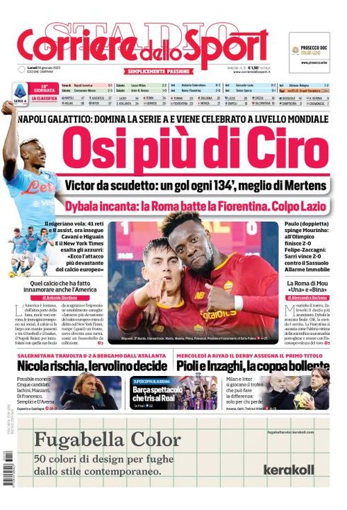 Il Corriere dello Sport, nella sua edizione Campania di oggi, apre in prima pagina con l'incredibile media-gol di Victor Osimhen: "Osi più di Ciro. Victor da scudetto: un gol ogni 134': meglio di Mertens. Il nigeriano vola: 41 reti e 8 assist. Ora insegue Cavani e Higuain. E il New York Times esalta gli azzurri: 'Ecco l'attacco più devastante del calcio europeo". In taglio basso spazio alla Salernitana con Nicola a un passo dall'esonero dopo il pesantissimo ko di Bergamo: "Nicola rischia, Iervolino decide".