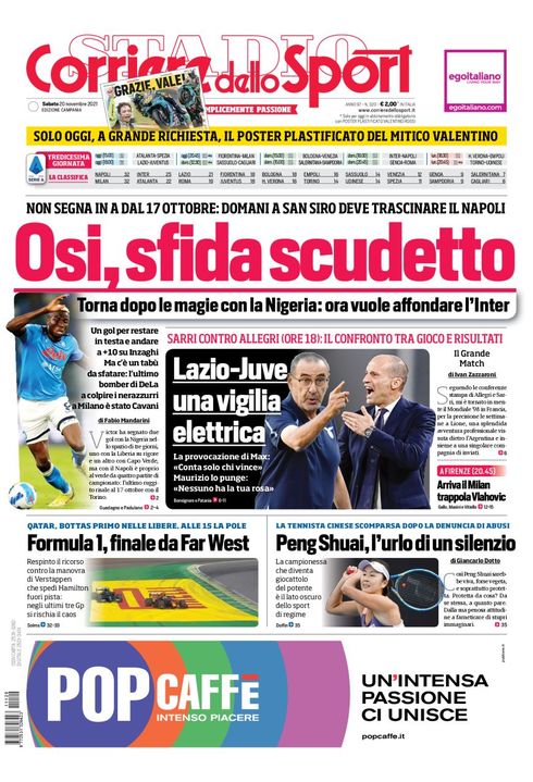 Il Corriere dello Sport, nella sua edizione Campania di oggi, apre in prima pagina con la sfida di San Siro tra Inter e Napoli: “Osi, sfida Scudetto. Non segna in A dal 17 ottobre: domani a San Siro deve trascinare il Napoli. Torna dopo le magie con la Nigeria: ora vuole affondare l'Inter. Un gol per restare in testa e andare a +10 su Inzaghi. Ma c'è un tabù da sfatare: l'ultimo bomber di DeLa a colpire i nerazzurri a Milano è stato Cavani". Spazio anche a Lazio- Juventus: "Lazio-Juve: una sfida elettrica".
