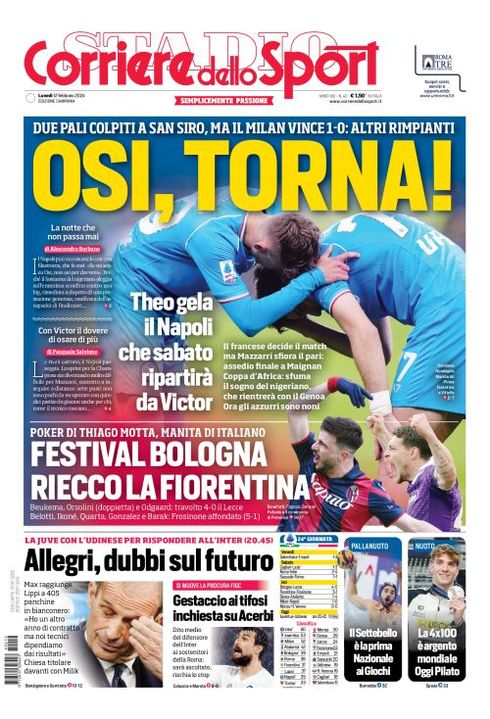 Il Corriere dello Sport, nella sua edizione Campania di oggi, dedica la prima pagina al ko del Napoli a San Siro contro il Milan e al prossimo rientro di Osimhen: "Osi, torna! Theo gela il Napoli che sabato ripartirà da Victor. Due pali colpiti a San Siro, ma il Milan vince 1-0: altri rimpianti".