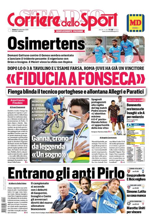 Secondo la prima pagina del Corriere dello Sport nella sua edizione Campania, nella sfida contro il Genoa Gattuso sarebbe orientato a schierare dal primo minuto Osimhen e Mertens: "Il nigeriano con Dries e Insigne. E Meret vince la sfida con Ospina". Di lato spazio all'esordio in campionato del Benevento contro l'Inter e alle dichiarazioni del tecnico giallorosso Pippo Inzaghi: "In A per restarci".