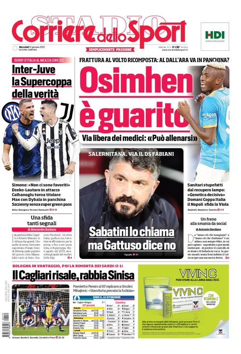 Il Corriere dello Sport, nella sua edizione Campania di oggi, apre in prima pagina con il ritorno all'attività del centravanti azzurro: "Osimhen è guarito. Via libera dai medici: 'Può allenarsi'. Frattura al volto ricomposta: al Dall'Ara va in panchina?". A centro pagina spazio alla Salernitana, alla ricerca di un nuovo assetto tecnico: "Sabatini lo chiama, ma Gattuso dice no. Via il ds Fabiani".