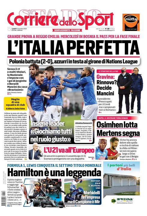 "Osimhen lotta, Mertens segna". Titola cosi in prima pagina il Corriere dello Sport nell'edizione Campania di oggi. "Victor ha ancora dolore alla spalla e rischia di saltare la sfida con il Milan: se non recupera spazio a Dreis in gol con il Belgio". A centro pagina spazio alla vittoria della Nazionale in Nations League contro la Polonia e alle dichiarazioni di Insigne: "Giochiamo tutti nel ruolo giusto".