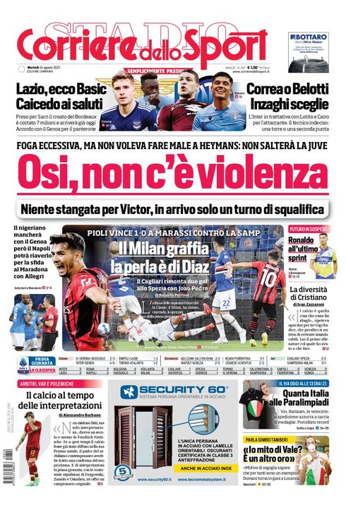 Osi, non c'è violenza, titola l'edizione campana del Corriere dello Sport raccontando che non ci sarà stangata per Osimhen. In arrivo infatti c'è solo un turno di squalifica e quindi non salterà la Juventus. In taglio centrale la vittoria del Milan e di spalla il futuro in bilico di Ronaldo.