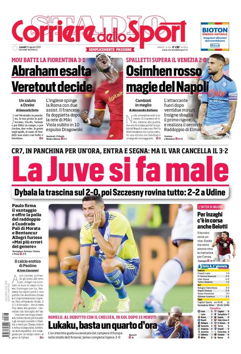 Il Corriere dello Sport, nella sua edizione Campania di oggi, titola in prima pagina: "Osimhen rosso: magie del Napoli. L'attaccante fuori dopo 22 minuti. Insigne sbaglia il primo rigore e realizza il secondo. Raddoppio di Elmas". A centro pagina il deludente pareggio della Juventus a Udine: "La Juve si fa male". In alto spazio alla vittoria della Roma contro la Fiorentina: "Abraham esalta: Veretout decide".