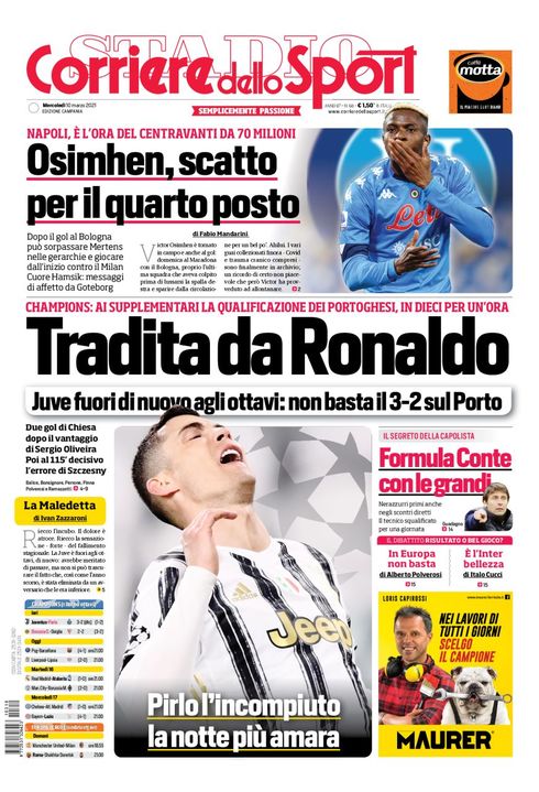 Il Corriere dello Sport, nella sua edizione Campania di oggi, dedica l'apertura della prima pagina a Victor Osimhen: "Osimhen, scatto per il quarto posto. Napoli, è l'ora del centravanti da 70 milioni. Dopo il gol al Bologna può sorpassare Mertens nelle gerarchie e giocare dall'inizio contro il Milan". In basso spazio al flop della Juventus in Champions League: "Pirlo l'incompiuto, la notte più amara".